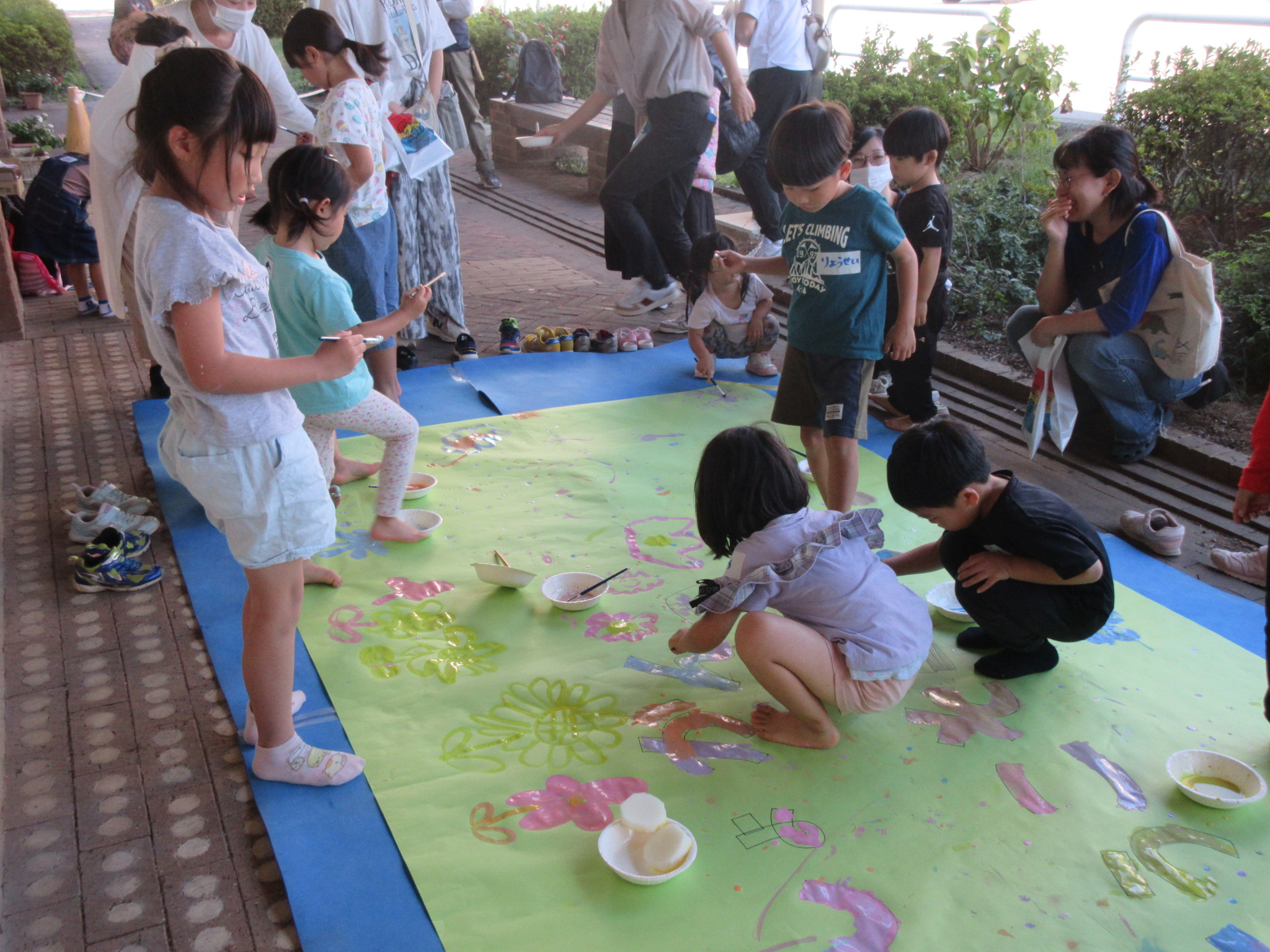 いよいよプロムナードでのびのびお絵かき開始!今年は緑の紙にお花畑をみんなで描きます。