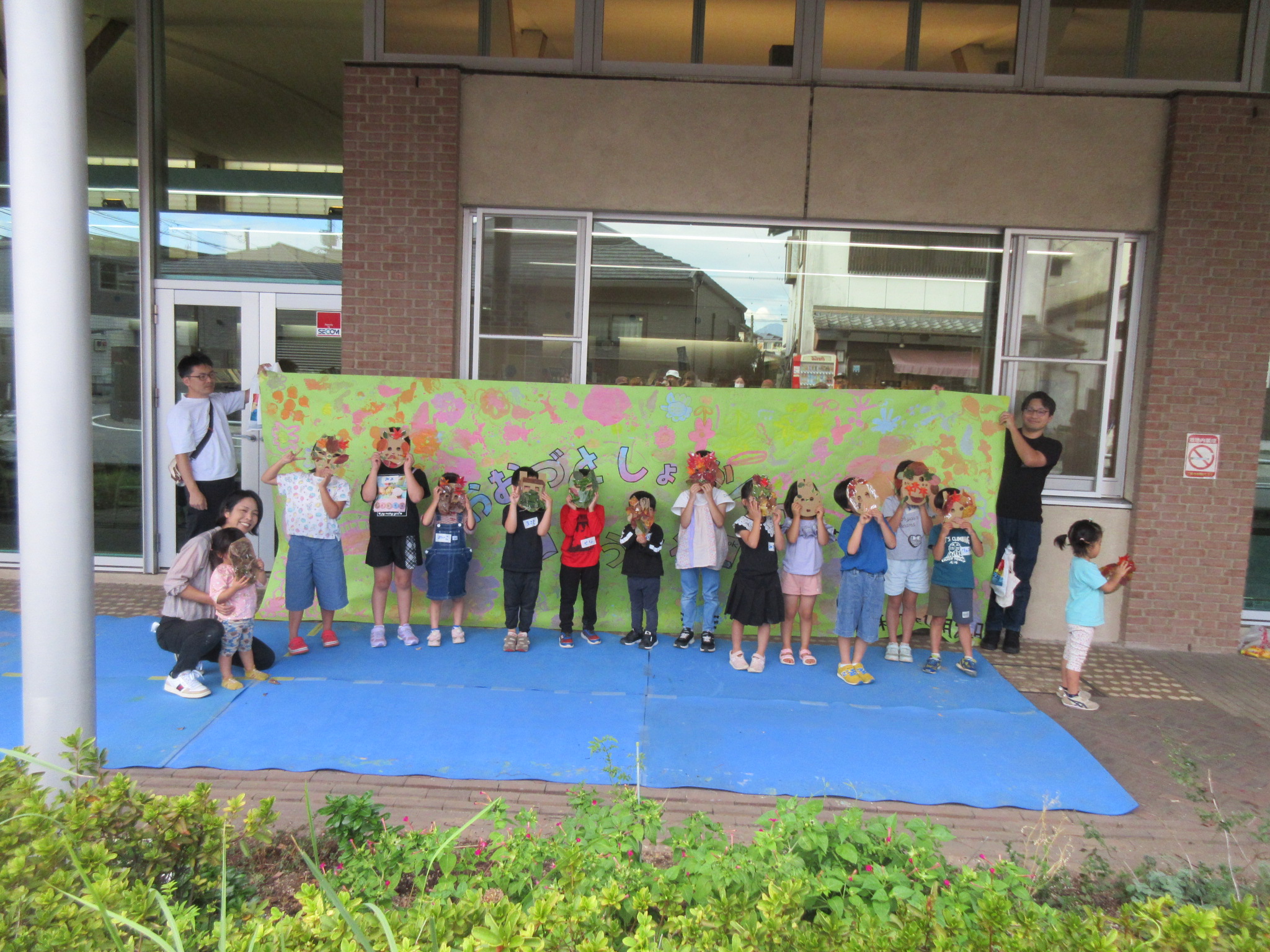 最後にお面を作って完成した絵の前で記念撮影!