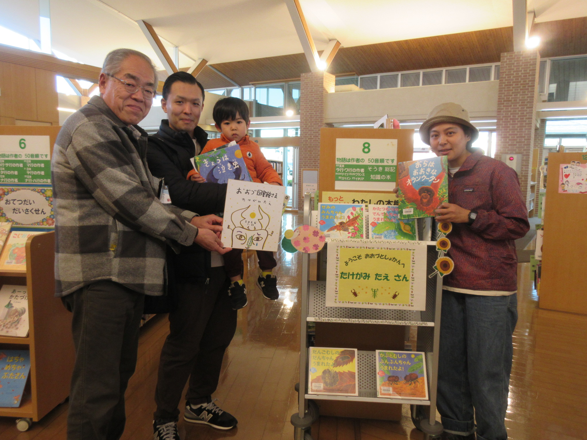 「おらは おおきな オランウータン」「きょうは泣き虫」など、おおづ図書館にもいっぱい所蔵している絵本作家のたけがみたえさんが突然のご来館!おおづ図書館では、特設をつくり大歓迎しました。さっそく借りていただいた親子づれの方もあり、楽しんでいただいたでしょうか~